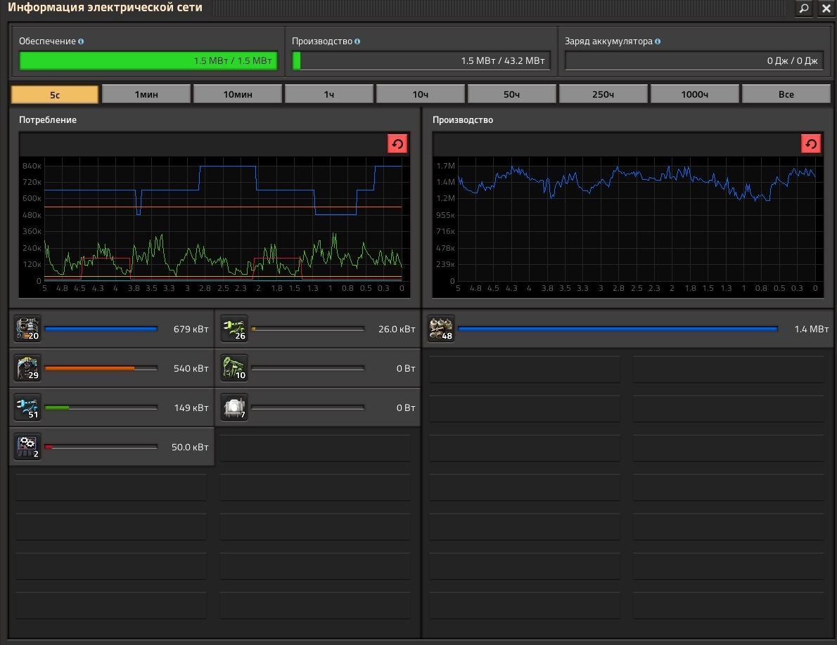 Нажав на любую опору ЛЭП вы сможете посмотреть статистику производства-потребления всех ваших структур в данной цепи. Вы можете разделять ваши производства, делая для каждой отдельный генератор электричества, но мы советуем вам всё централизовать, чтобы всегда всё видеть и не бегать лишний раз по карте, чтобы убедиться в порядке.